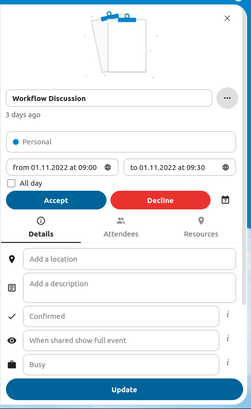 You may add attendees to an event to let them know they’re invited. They will receive an email invitation and will be able to confirm or cancel their participation to the event. Attendees may be other users on your Nextcloud instances, contacts in your address books and direct email addresses. You may also change the level of participation per attendees, or disable the email information for a specific attendee.