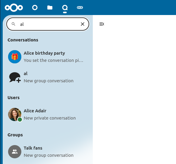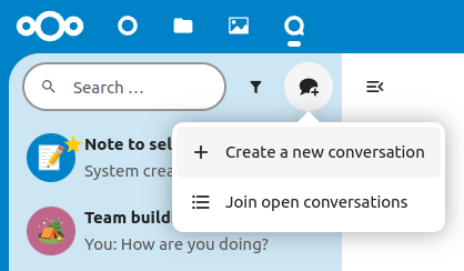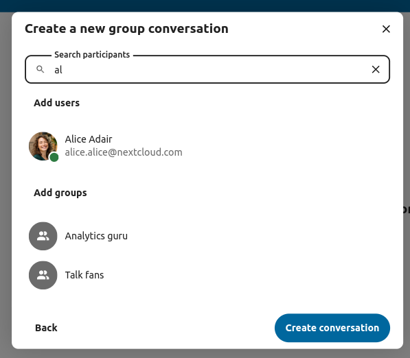Group conversations. Besides the person who created the conversation, a group conversation can have any number of people in it. A group conversation can be shared publicly with a link, so external guest users can join a call. It can also be listed, so other people on your Nextcloud server can join the conversation.