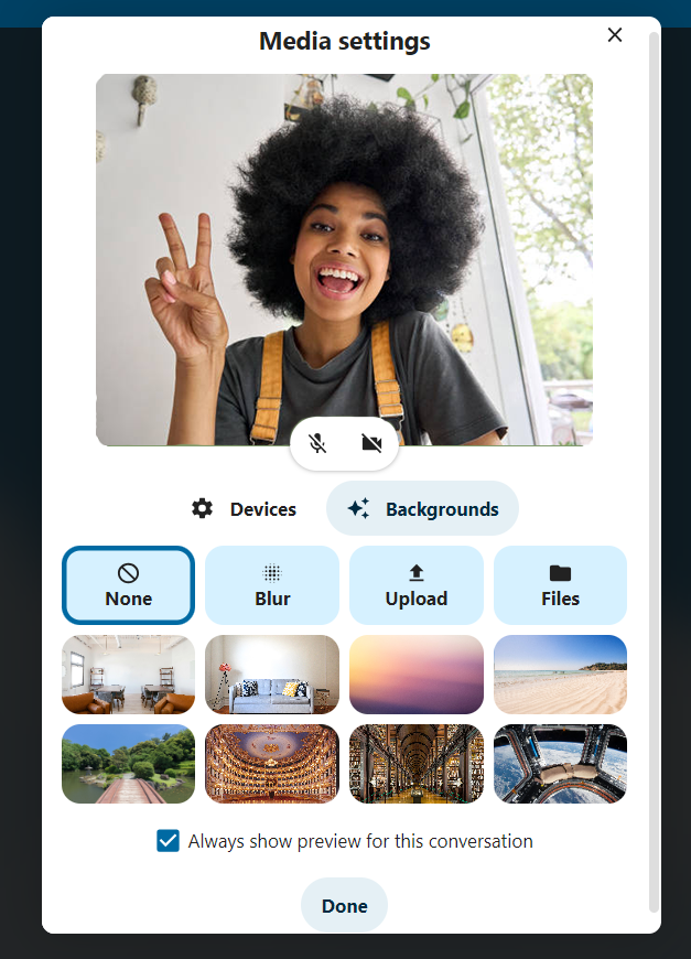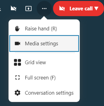 You can access your settings and choose a different webcam, microphone and other settings in the ... menu in the top bar.