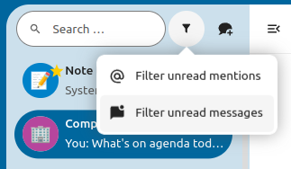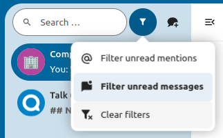 You can filter your conversations using the filter button located next to the search field. There are two options for filtering: 1. Filter unread mentions: This option allows you to view group conversations with unread mentions or unread one-on-one conversations. 2. Filter unread messages: This option allows you to view all unread messages in all joined conversations.