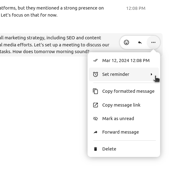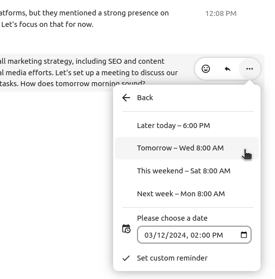 You can set reminders on specific messages. If there’s an important message you want to be notified about later, simply hover over it and click on the reminder icon.