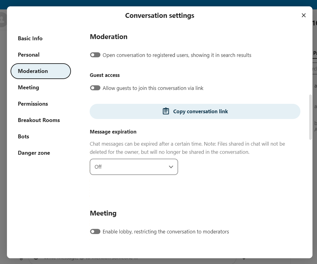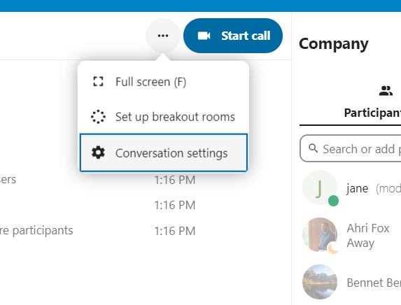Moderators can configure the conversation. Select Conversation settings from the ... menu of the conversation on the top to access the settings.