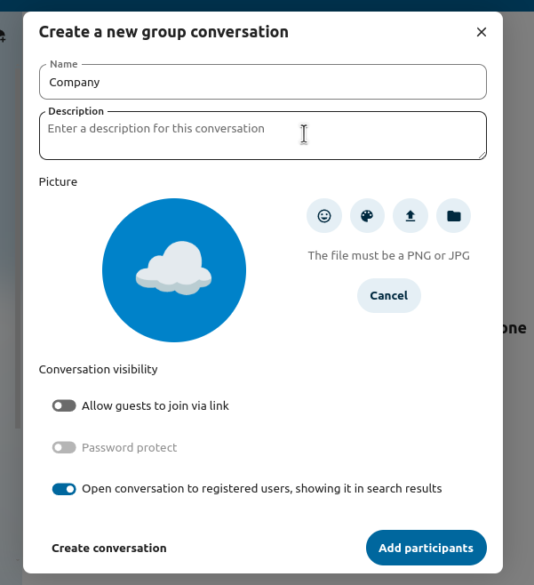 You can then pick a name for the conversation, put a description, and set up an avatar for it (with uploaded photo or emoji), and select if the conversation should be open to external users and if other users on the server can see and join the conversation.