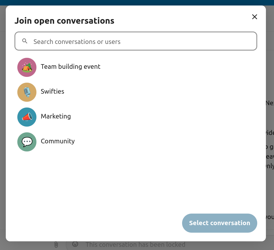 You can view all the conversations that you can join by clicking the button next to the search field and filters button and then on Join open conversations.