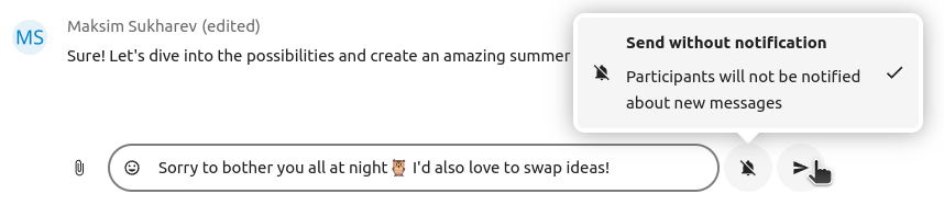 If you don’t want to disturb anyone in the middle of the night, there is a silent mode for chatting. While it is enabled, other participants will not receive notifications from your messages.