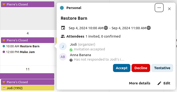 You can directly respond to invitations inside the app. Click on the event and select your participation status. You can respond to an invitation by accepting, declining or accepting tentatively.