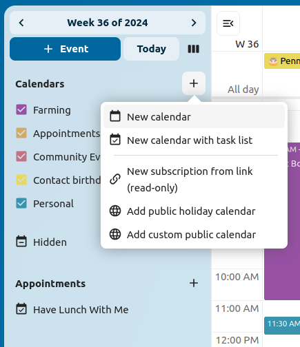 As of Calendar v3 the app can generate appointment slots which other Nextcloud users but also people without an account on the instance can book. Appointments offer fine-granular control over when you are possibly free to meet up. This can eliminate the need to send emails back and forth to settle on a date and time.