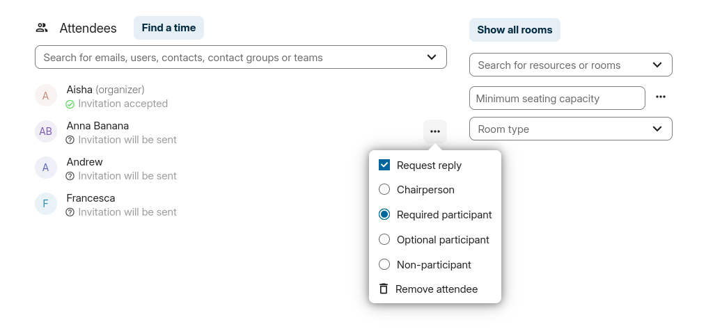 Similar to attendees you can add rooms and resources to your events. The system will make sure that each room and resource is booked without conflict. The first time a user adds the room or resource to an event, it will show as accepted. Any further events at overlapping times will show the room or resource as rejected.