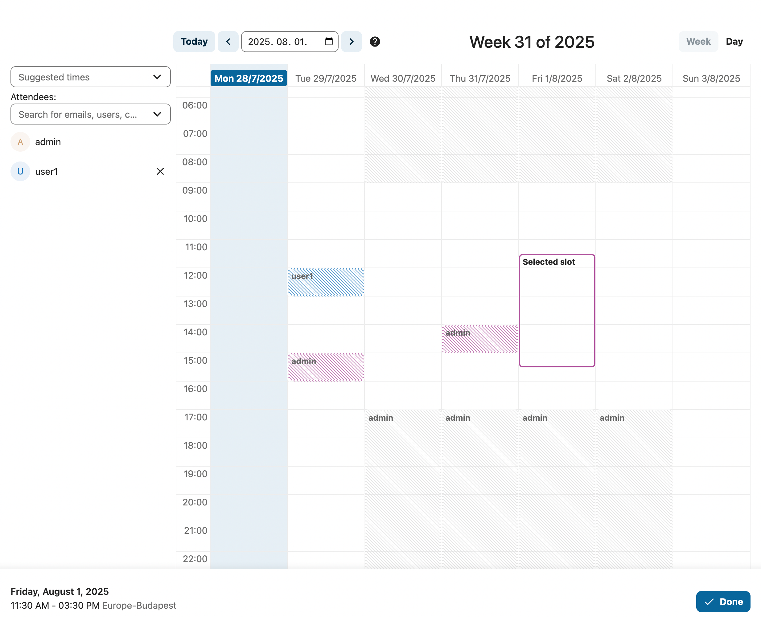 When adding other Nextcloud users as attendees to an event, you may access their free-busy information if available, helping you determine when the best time slot for your event is. Set your working hours to let others know when you are available. Free-busy information is only available for other users on the same Nextcloud instance.