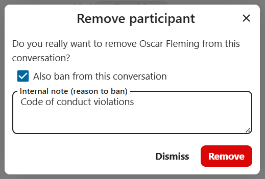 To help keep discussions safe and under control, moderators can ban participants from conversations. It could be internal users or guests (in this case their IP-addresse will additionally be banned).
