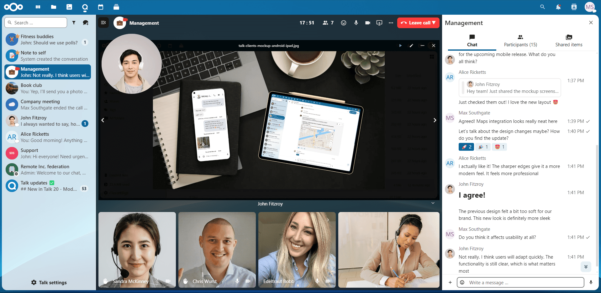 Nextcloud Talk lets you chat and have video calls on your own server.