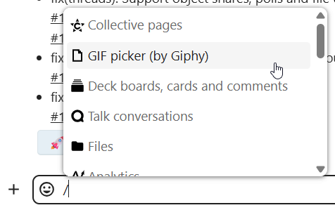 Smart picker shortcut makes it easier to insert links, files, or other content into your conversations. Just choose the type of content you want to insert (files, Talk conversations, Deck cards, GIFs, etc.) You can also type / in the chat input to open the selector.