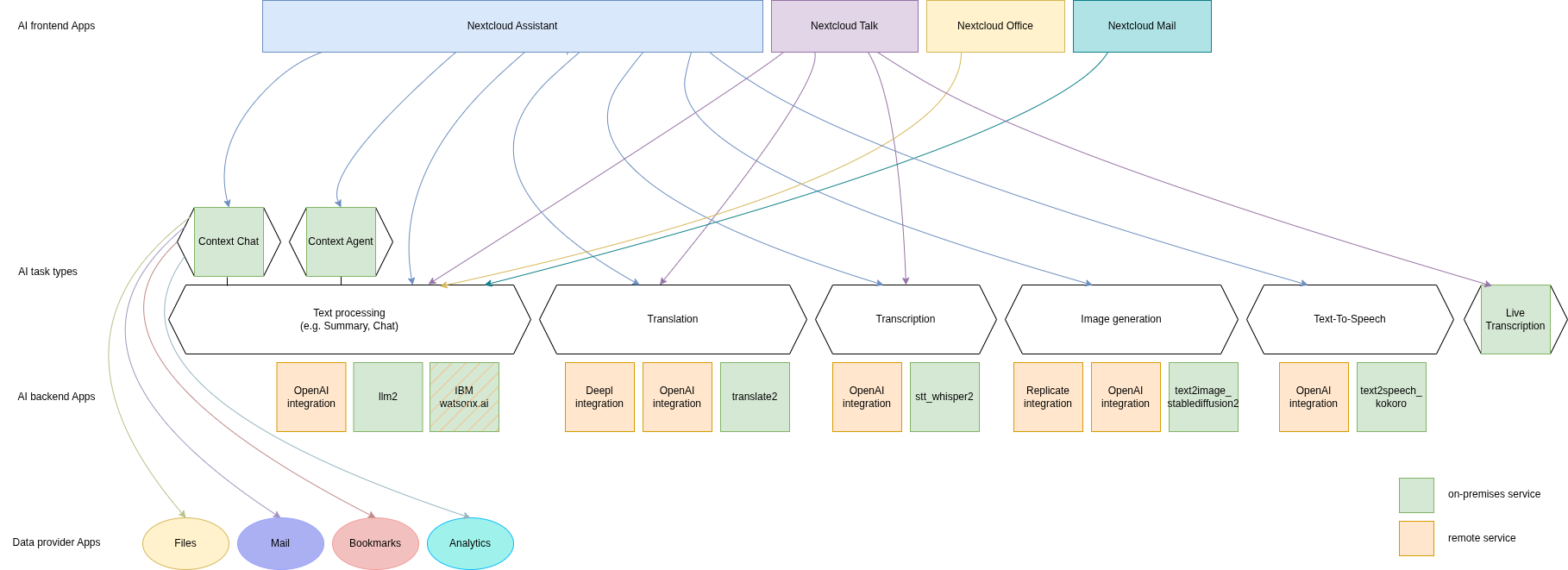 Nextcloud uses modularity to separate raw AI functionality from the Graphical User interfaces and apps that make use of said functionality. Each instance can thus make use of various backends that provide the functionality for the same frontends and the same functionality can be implemented by multiple apps using on-premises processing or third-party AI service providers.