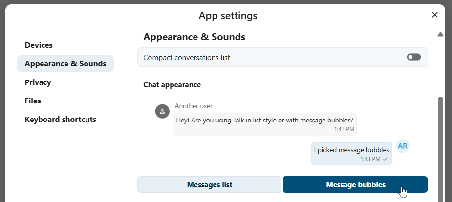 Chat appearance settings allow you to customize the look of your conversation chats. You can choose between classic list or message bubbles, with your own messages on the side.
