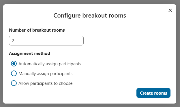 A dialog will open where you can specify the number of rooms you want to create and the participants assignment method. You have three options: