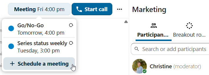 It is possible to schedule a meeting directly from a conversation. In the dialog, you can set meeting details such as title, date, time and description. You can also choose to invite all participants including email guests, or select specific ones.