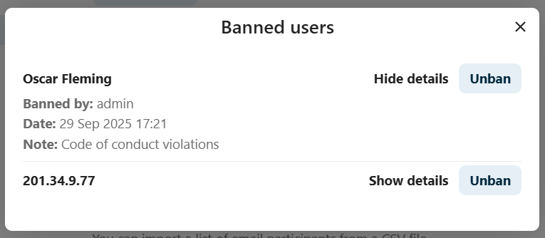 To help keep discussions safe and under control, moderators can ban participants from conversations. This applies to internal users and guests alike; for guests, their IP address will also be banned.