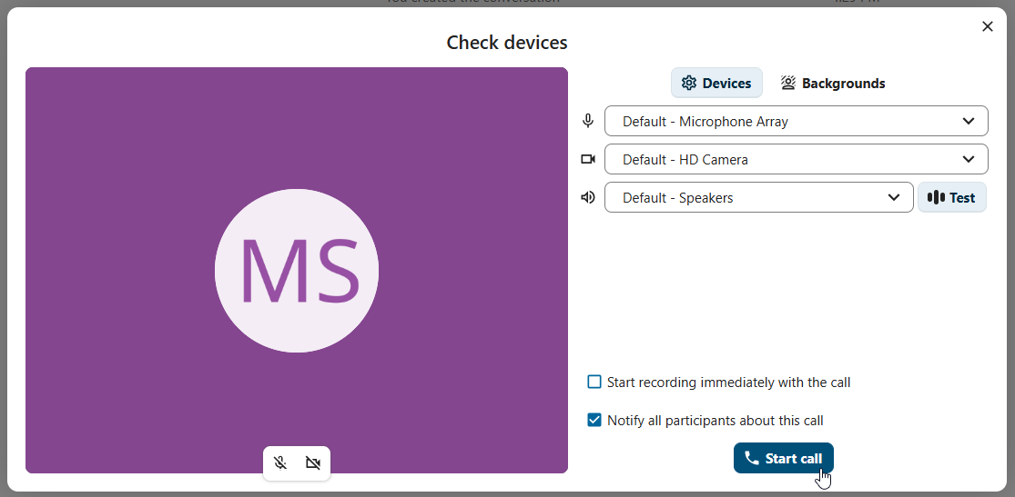 Before joining, you will see a device check where you can select your camera and microphone, enable background blur, or join without any devices.