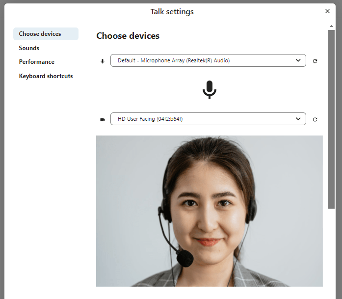 Your camera and microphone settings can be found in the Settings menu. There you can also find a list of shortcuts you can use.