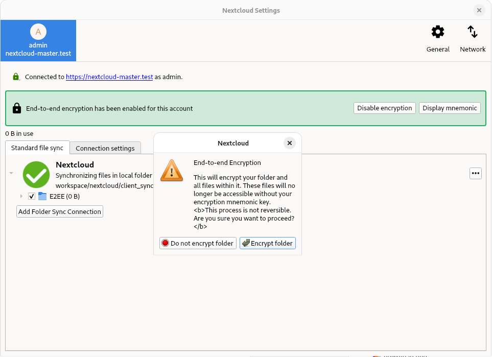 In the browser, first enable E2EE in the personal settings. This is needed, as E2EE is less secure in the browser, requiring you to fully trust the administrator to not alter the source code the browser will execute. E2EE folders are currently read-only. Therefore, it is not possible to add, remove, edit, or share an E2EE file from the browser.