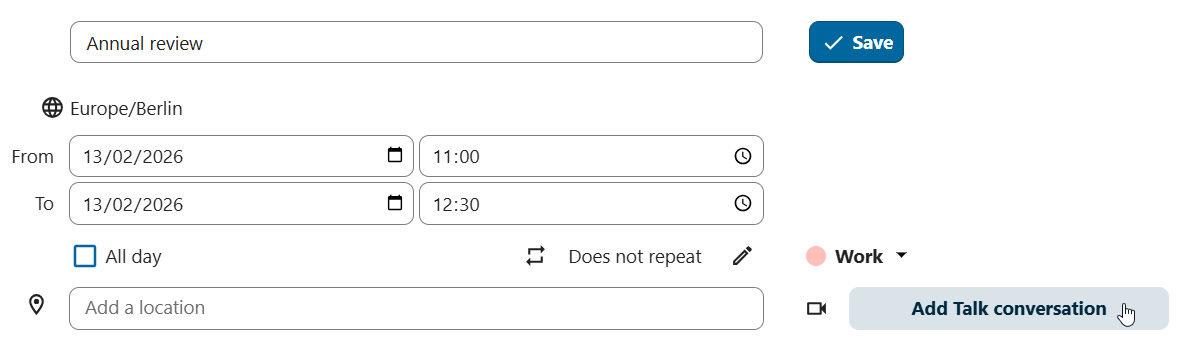 When creating a new event in Calendar, you can set a Talk conversation as event location. This will create a new conversation if one does not exist yet.