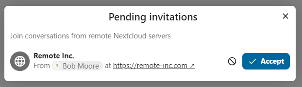 With Federation feature, users can create conversations across different federated Talk instances and use Talk features as if they were on a same server.