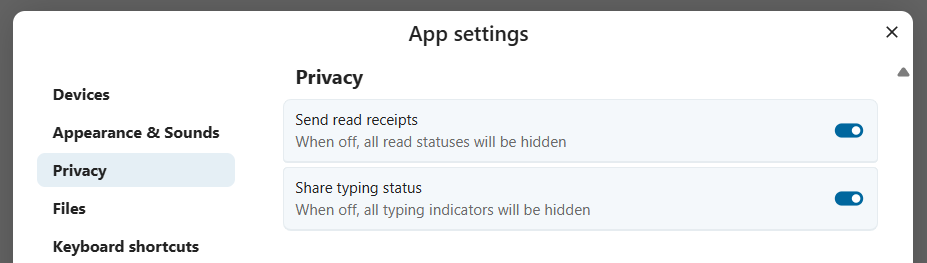 To have more control over your privacy, you can also configure the visibility of your typing and read indicators in Talk settings: