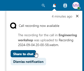 After stopping a recording, the server will take some time to prepare and save the recorded file. The moderator, who started the recording, receives a notification when the file is uploaded. From there, it can be shared in the chat.