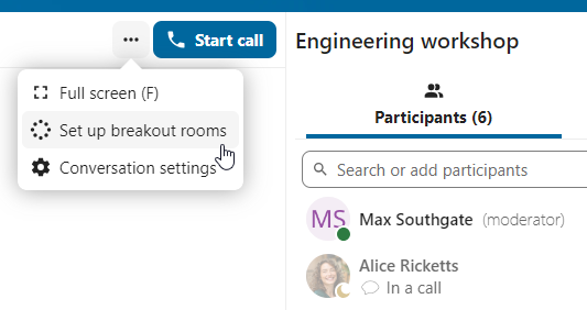 To create breakout rooms, you need to be a moderator in a group conversation. Click on the top-bar menu and click on “Setup breakout rooms”.