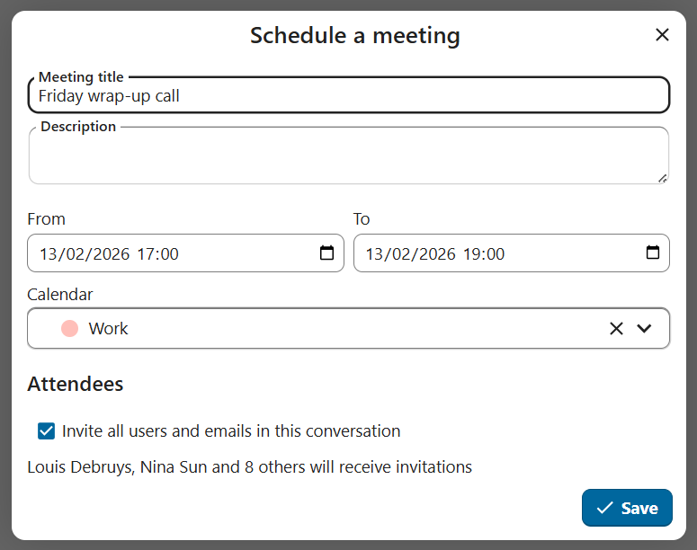 It is possible to schedule a meeting directly from a conversation. In the dialog, you can set meeting details such as title, date, time and description. You can also choose to invite all participants including email guests, or select specific ones.